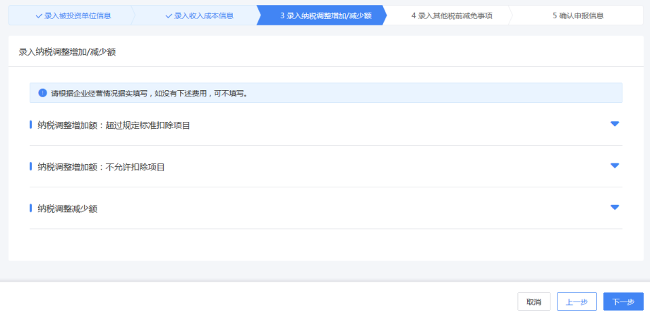5. 录入纳税调整增加/减少额,若企业没有相关纳税数据,可直接点击【下一步】。